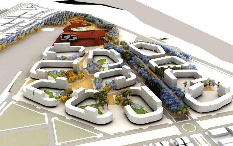Hacienda El Rosario, Sevilla, Spain. A proposed group of blocks with over a thousand flats, which would be the biggest in Spain. Includes a huge 33 thousand square meter park in the middle, swimming pool included, much needed with 40+ degrees in the summer.