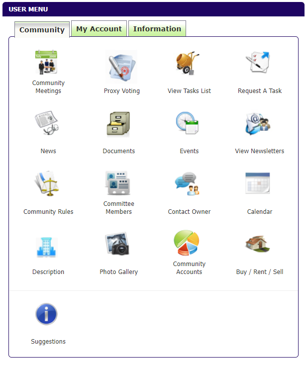 Community Rules, Committee Members, A link to allow you to contact other owners, A full calendar of events, Description of the community, A community Photo Gallery and Buy / Sell / Rent option for your property or any second hand items you may have.